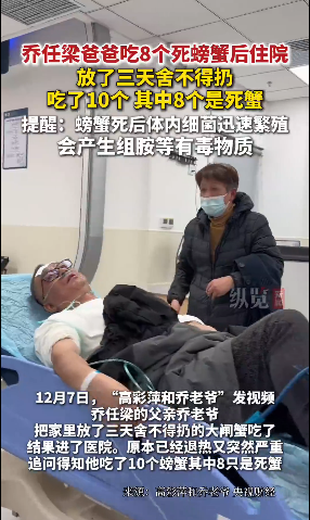 近日,乔任梁父母酬酢账号“高彩萍和乔老爷”发布视频,称乔任梁父亲因舍不得丢弃家中已存放三日的大闸蟹,在食用后出现食品中毒症状,发热入院。视频中知道,他共吃了10只螃蟹,其中8只为死蟹,导致病情在瞬息退热后再次加剧。